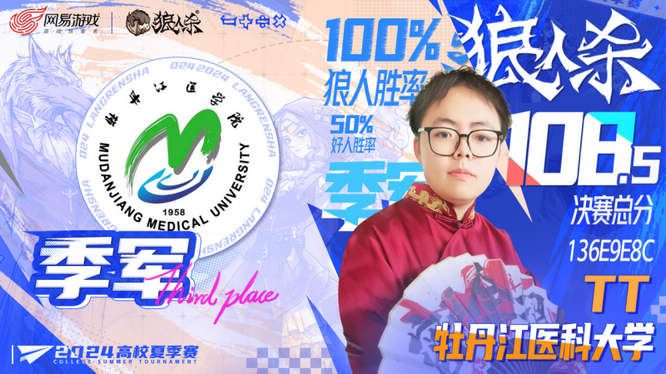 北京化工大学的天杪在本次比赛中以狼人胜率100%和好人阵营胜率75%的亮眼表现斩获高校夏季赛亚军的头衔。牡丹江医科大学的TT也以108.5的优异成绩,成为本届高校夏季赛的季军。两位选手都在整场比赛中有着不错的发挥。