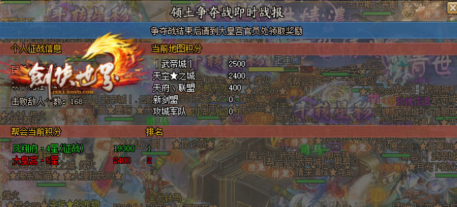 经历了一周的激烈角逐,四大主城全部被占领,分别为:天空★之城帮会占领了凤翔府、新剑盟帮会占领了襄阳府、丨武帝城丨帮会占领了成都府以及天府丶联盟帮会占领了扬州府。现在四大帮会将向大皇宫发起最后的冲锋!