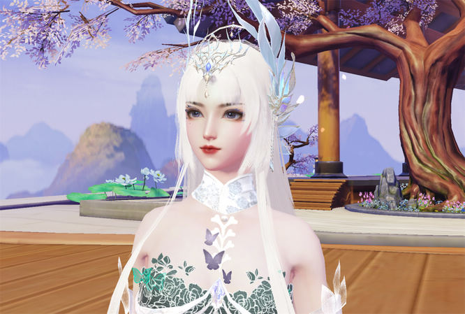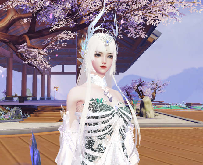 雪发少女于伏羲村驻足,头饰上的挂坠在额间晃动,齐刘海遮盖住细眉,右眼下一点泪痣令她看起来少了几分凌厉。浅灰色的眸子里倒映出万千繁花,像装载着满园的春色~