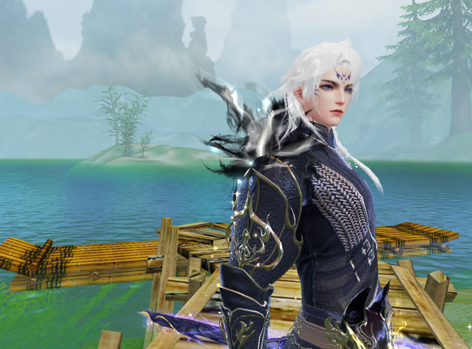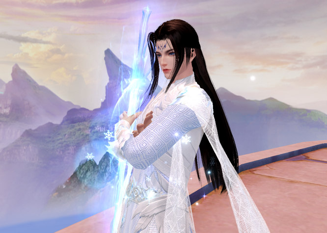 少侠长发飘飘泠然若仙,【月照梨花】的轻羽软甲将他的水色长袍紧紧包裹。抱剑而立的他面容冷峻,一双灰眸如寒潭深井,薄唇紧抿,岿然不动,仿佛时间都与他一起静止了~