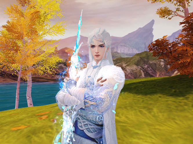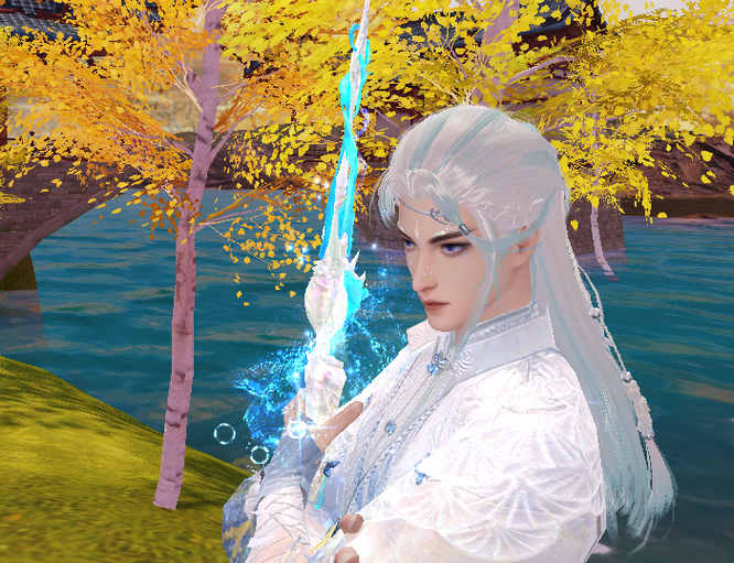 少侠抱胸驻足中原银杏旁,一身【苍玉幽香】清丽秀雅,眉眼上描绘的银云纹饰,在日光照耀下散发着夺目光彩。璀璨星瞳注视着远方,少侠目光深邃而坚定,手执长剑独闯天下~