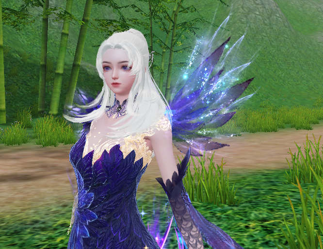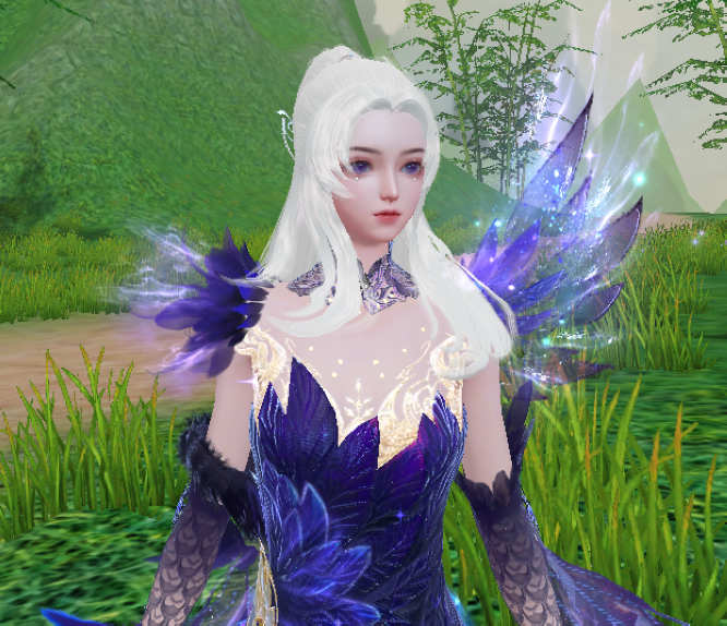 春庭晓景别,清露花逦迤。在幽静的丛林中,少女将银发随意束起,额前的刘海也未能遮盖那双动人的杏眼。眼角处微微泛红,柳叶眉尽显大方温柔,美人朱唇微抿款款而来,犹如在林中绽放的紫色鸢尾~
