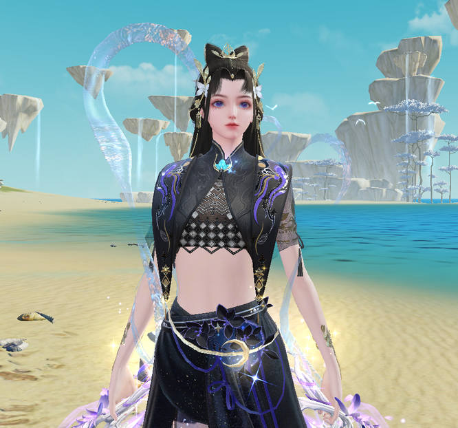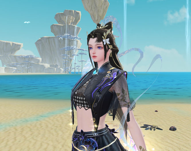 碧蓝海水静谧无浪,少女脸若银盘腮颊似桃,素花金叶装点发髻,衬托得少侠更加玲珑可爱。柳眉黛眸,顾盼流离间不经意勾人心魂,似是锦画中步入人间的仙子~