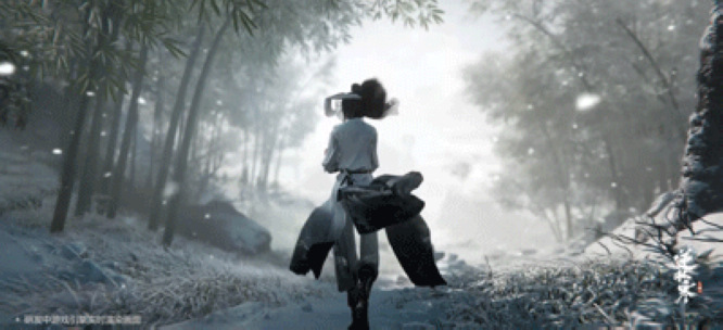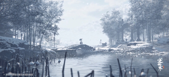 除了依旧“美美美”的画质表现外,还能发现一个细节:不同的天气将会对人物产生不同的影响。初雪时,角色打着伞漫步小桥流水;而风雪交加时,角色不得不蜷缩着身体取暖御寒,还会举起手臂来阻挡寒风。