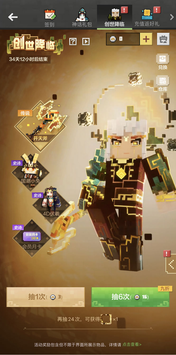 盘古一斧开阴阳,一人换得万物生。方块世界的盘古荣光加身、目光如炬,金石浮动在他的胸前,与额头印结共同闪耀。散发夺目光芒的流火之锤,神斧轻轻挥舞,便如太阳流转于天地。他背后的古代轮盘闪闪发光,如同命运不停轮转。4月28日,创世降临抽奖活动开启!使用抽奖币抽奖即可获得丰厚奖励,最高可获得传说皮肤【4D创世盘古】!你会抽中怎样的奖励呢?