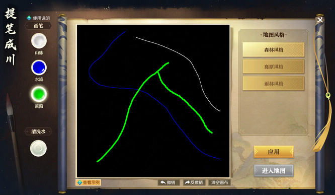 无门槛是由于其操作非常简单,只需要玩家在森林、高原、雨林几种地貌中选择好地图风格,然后用不同颜色的线条示意画出山川、水流、道路的走向,就可以通过AIGC技术智能生成栩栩如生的游戏地图,即使幼儿园的小朋友也能完成这个操作。
