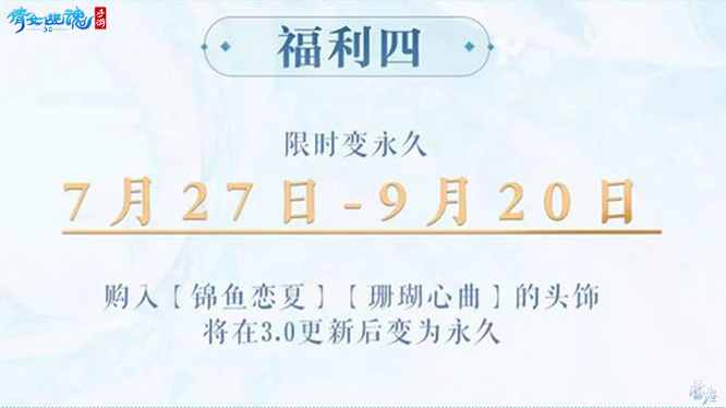 3.0版本更新后的首月,大家一共有男女各8款永久外观可以选择。具体包括下图中6款现有款式和两款全新永久外观【晴时雨】和【涂山魅语】。永久外观获得方式可参考通用外观转永久公式。在永久外观上线之际,开发组也准备了大量的福利给予各位玩家。看完今天的内容,不知道大家有没有更期待3.0版本了呢,届时我们相约三界,不见不散!