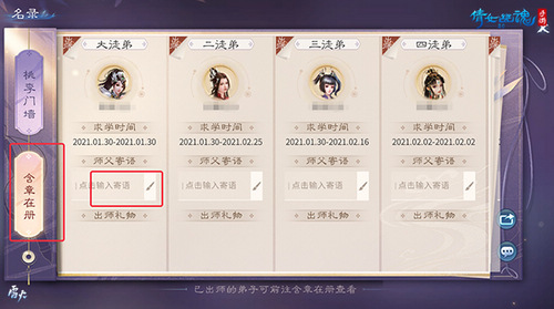 寻师收徒均可添加个性化标签,添置完毕后,可通过系统结识到与自己有缘的师父或徒弟,相约结伴!拜师收徒后,将获得师徒培养手册。老夫子精心制订全新的培养计划,在原本师徒培养手册上加以改进,更易培养师徒情谊,赢得师徒嘉奖!使用手册或在金陵寻找老夫子,皆可打开全新界面,轻松查看师徒事宜。