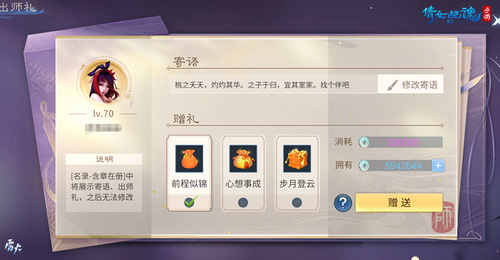 同时也新增了师徒群聊、礼赠等功能。师父可在师门事宜里创建群聊,同师门内肆意交谈!亦可在佳节期间馈赠好礼,让师徒间更加融洽。除此之外,师父可以为徒弟备一份由老夫子精心挑选的出师礼,徒弟还可获得拜师出师纪念道具,以铭记师恩。师门事宜的名录则记载了徒弟们何时拜师以及出师的信息,师父可翻阅以追忆点滴,亦可留下谆谆寄语。