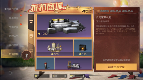 11月3日-12月1日, 参与【生存之星】、【绝对人气】活动,即可获得限时信用点和大额满减优惠券。限时信用点可用于在折扣商店免费兑换永久限定时装、珍稀家具礼包、改名卡等丰厚奖励!